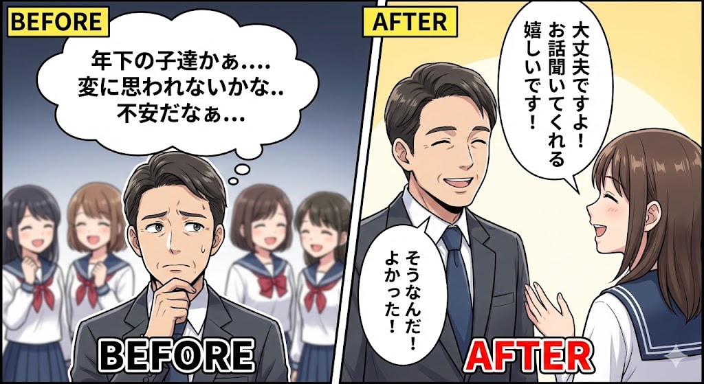 18歳に向けた気遣いをマスターすると、「この人なら安心」と思ってもらう事ができ、より10代の子達と仲良く楽しい時間が楽しめます!