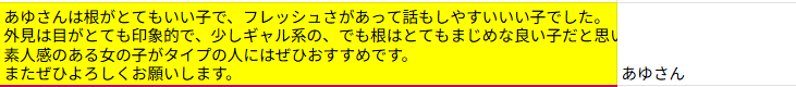 アイドルのオーディションにやってきそうな可愛さを持った「つき」ちゃんは間違いなくお勧めと言える美少女の一人!抜群のルックス、低身長で体も華奢という事なしの女の子!性格も穏やかで優しい感じ。指名して間違いなし!